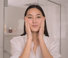 ใช้วิธีกดเพื่อระบายของเสียในร่างกายสำหรับกระตุ้นการไหลเวียนเลือด คืนความกระจ่างใสให้ผิวและช่วยให้ผิวกระชับ 3 ครั้งที่คาง 3 ครั้งที่หน้าผาก 5 ครั้งบริเวณลำคอและเนินอก